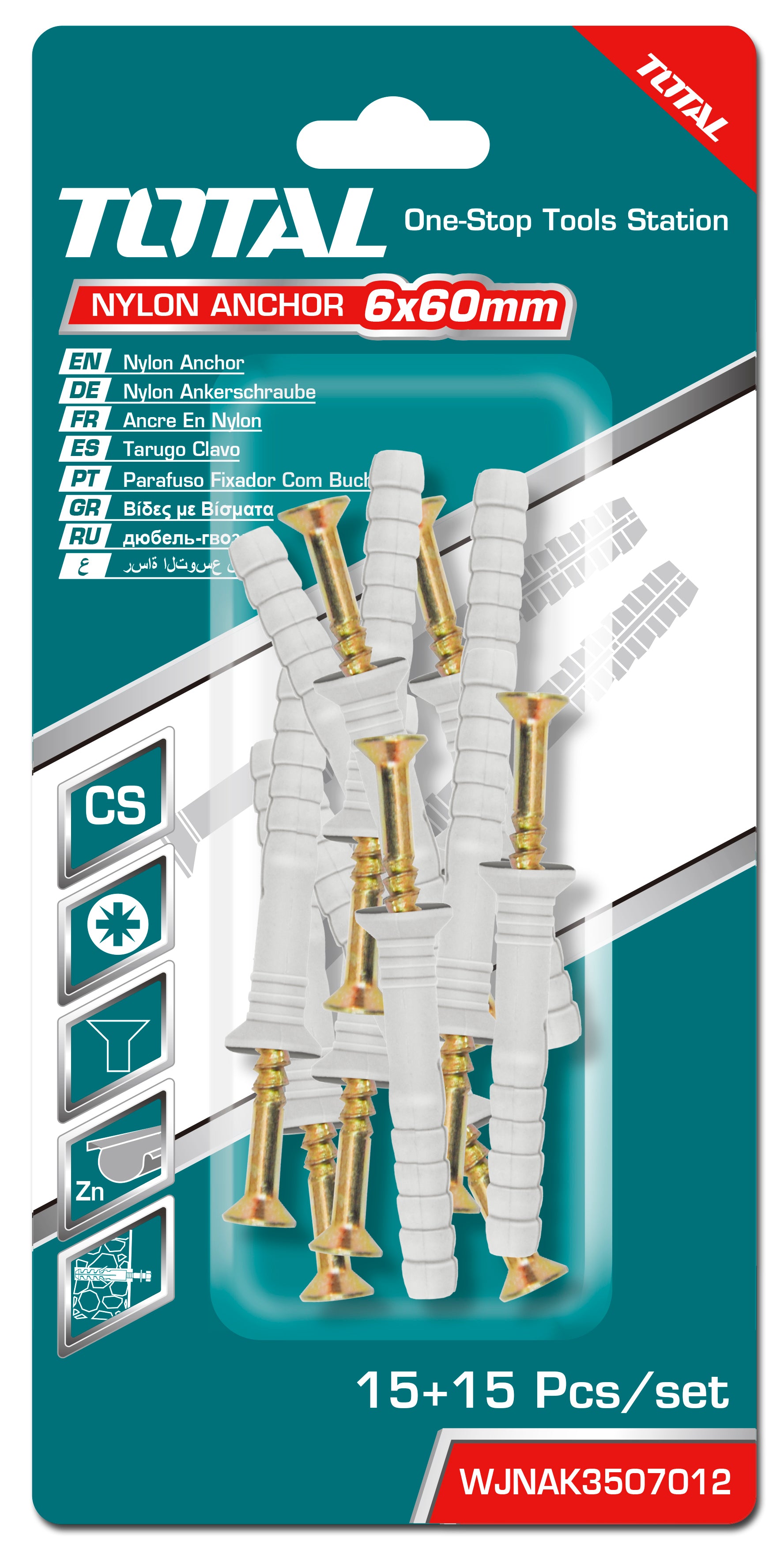 Regular price 19.95 AEDSale price 19.95 AED Regular priceUnit price perSale Sold outNylon anchor (WJNAK3507012) Plug: 6 x 60mm Material: Nylon, Grey color Screw: 3.5 x 70mm Pozidriv, CSK head Heat treated Yellow Zinc plated finish Set of 15 pieces + 15 pieces