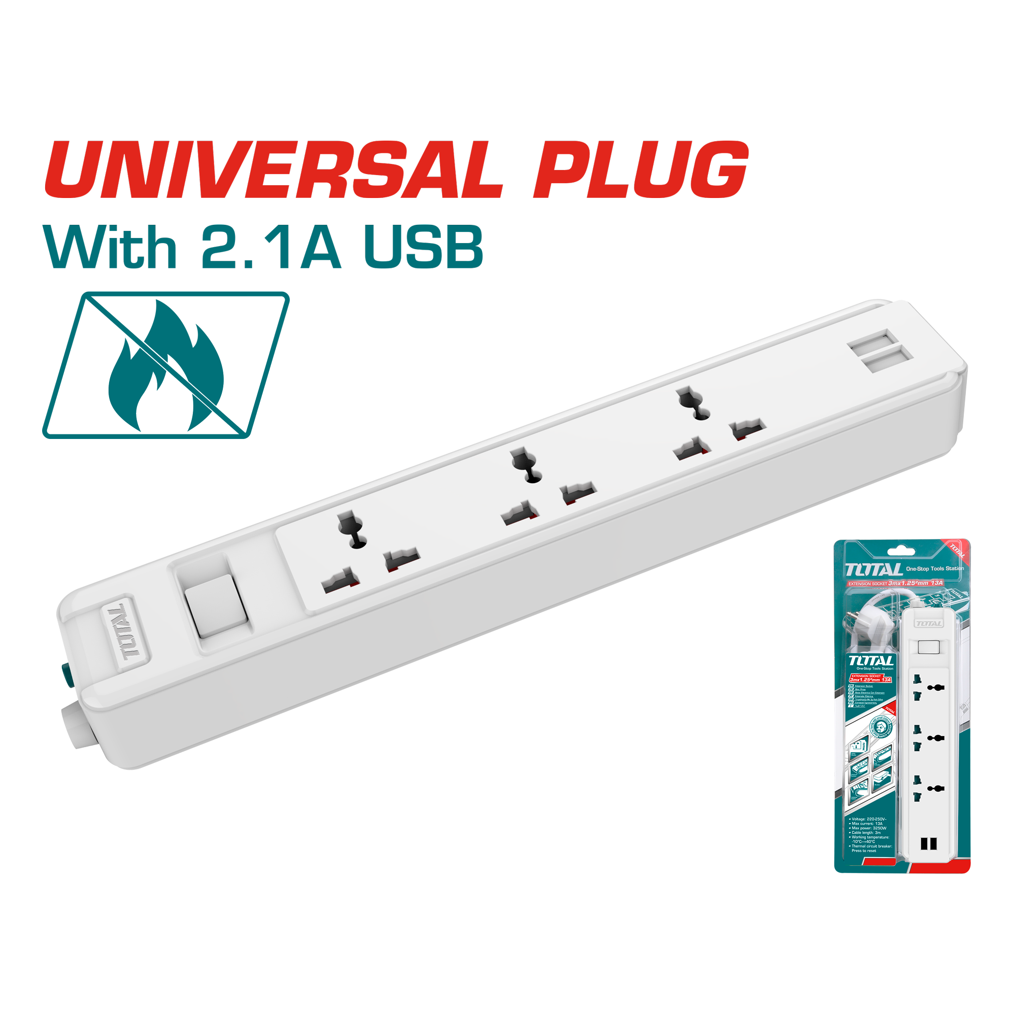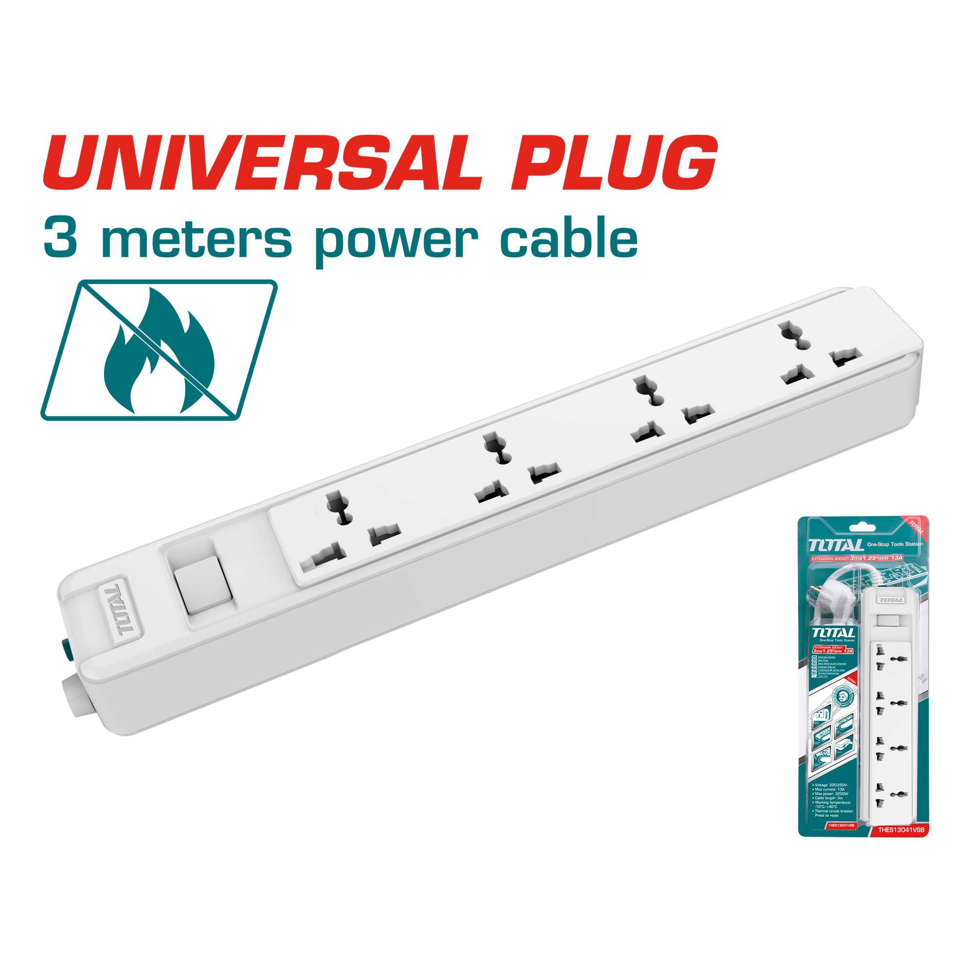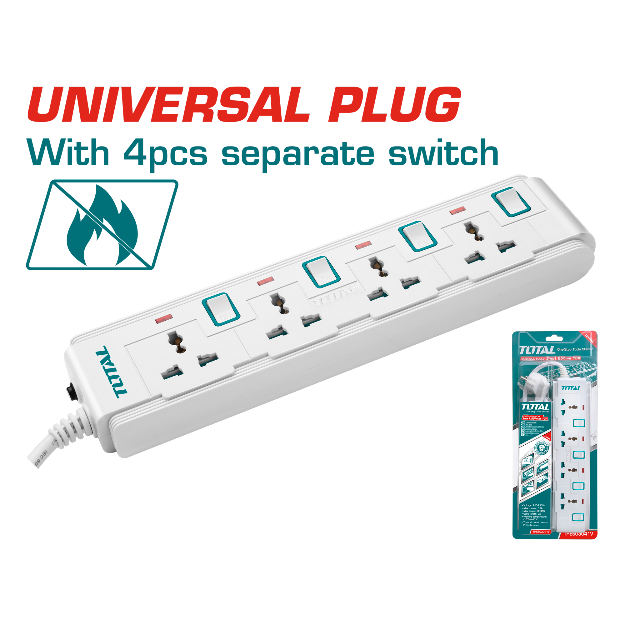Regular price 0.00 AEDSale price 0.00 AED Regular priceUnit price perSale Sold outTOTAL Extension socket (THES03041V) Maximum current: 13A 3 meters (3m x 1.25mm²) power cable With overload protection Flame retardant material Comes with 4 separate switches Copper wire inside construction