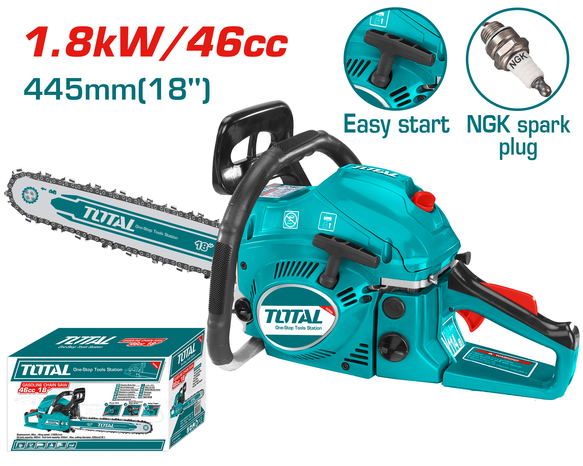 Regular price 0.00 AEDSale price 0.00 AED Regular priceUnit price perSale Sold outTOTAL Gasoline chain saw (TG5451811) Displacement: 46ccRated power: 1.8kW (2.4HP)Engine idle speed: 3100rpm (±300)Max. cutting diameter: 445mm (18")Spark plug: NGKFuel tank capacity: 550mlOil tank capacity: 260mlPowerful...