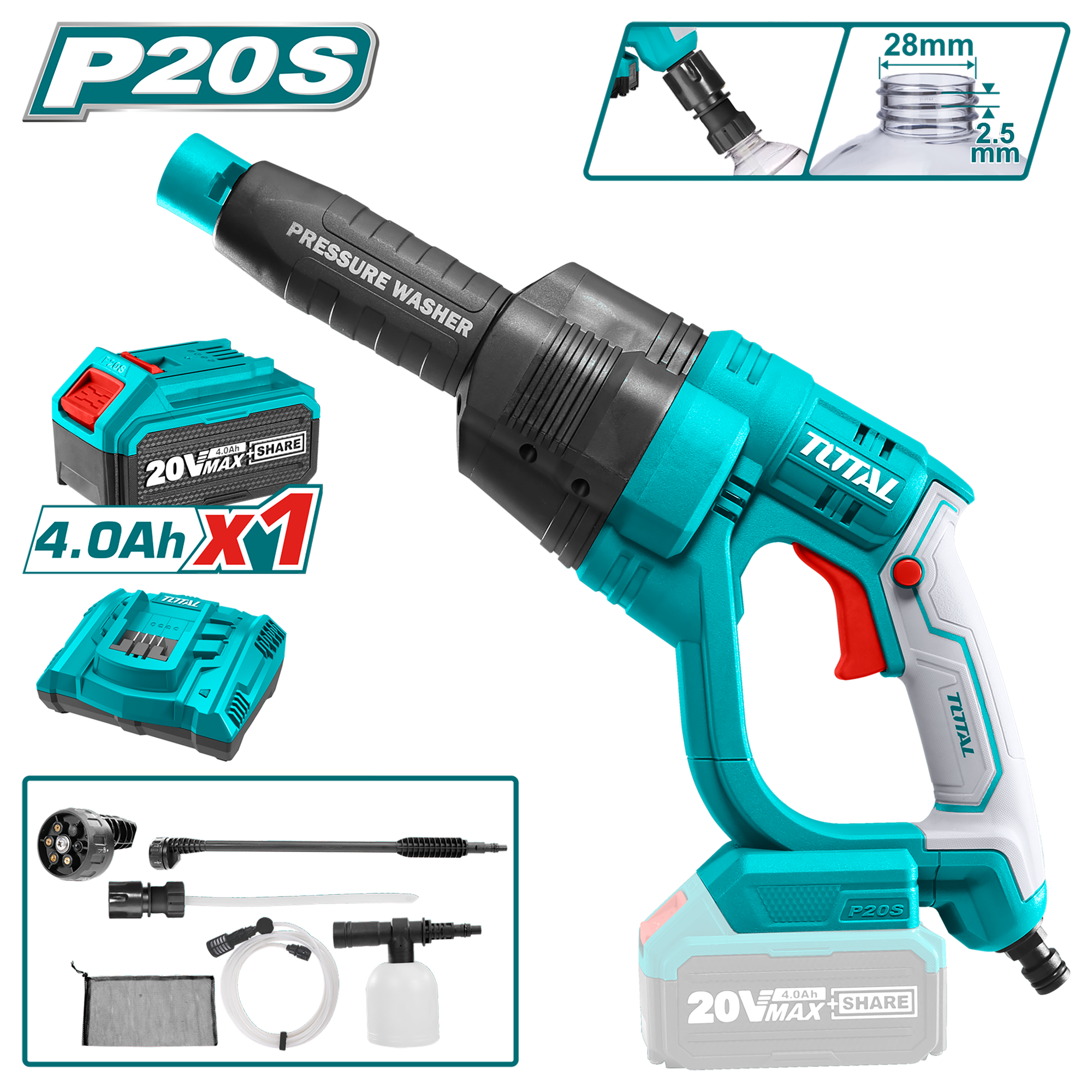 Regular price 369.00 AEDSale price 369.00 AED Regular priceUnit price perSale Sold outTOTAL Cordless pressure washer (TPWLI20084) Voltage: 20VMax pressure: 24.8BARFlow rate: 2.2L/minAuto stop systemSet includes: 1 piece 4.0Ah TOTAL battery (TFBLI2002) 1 piece TOTAL fast charger (TFCLI20411)...